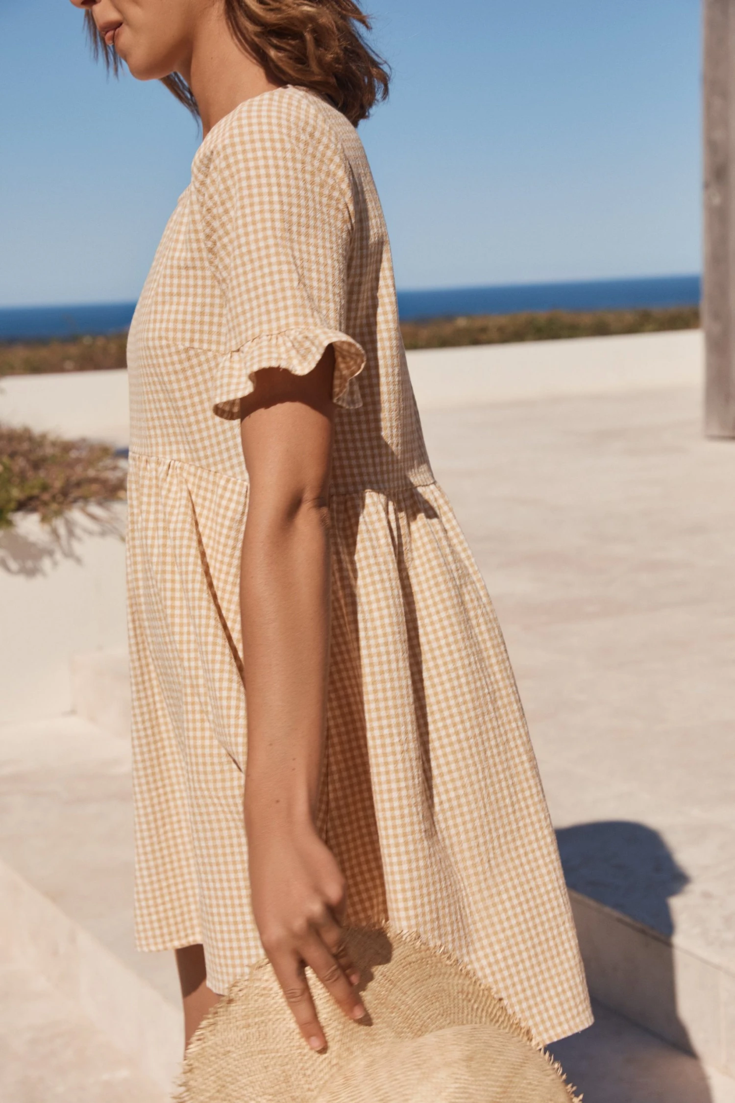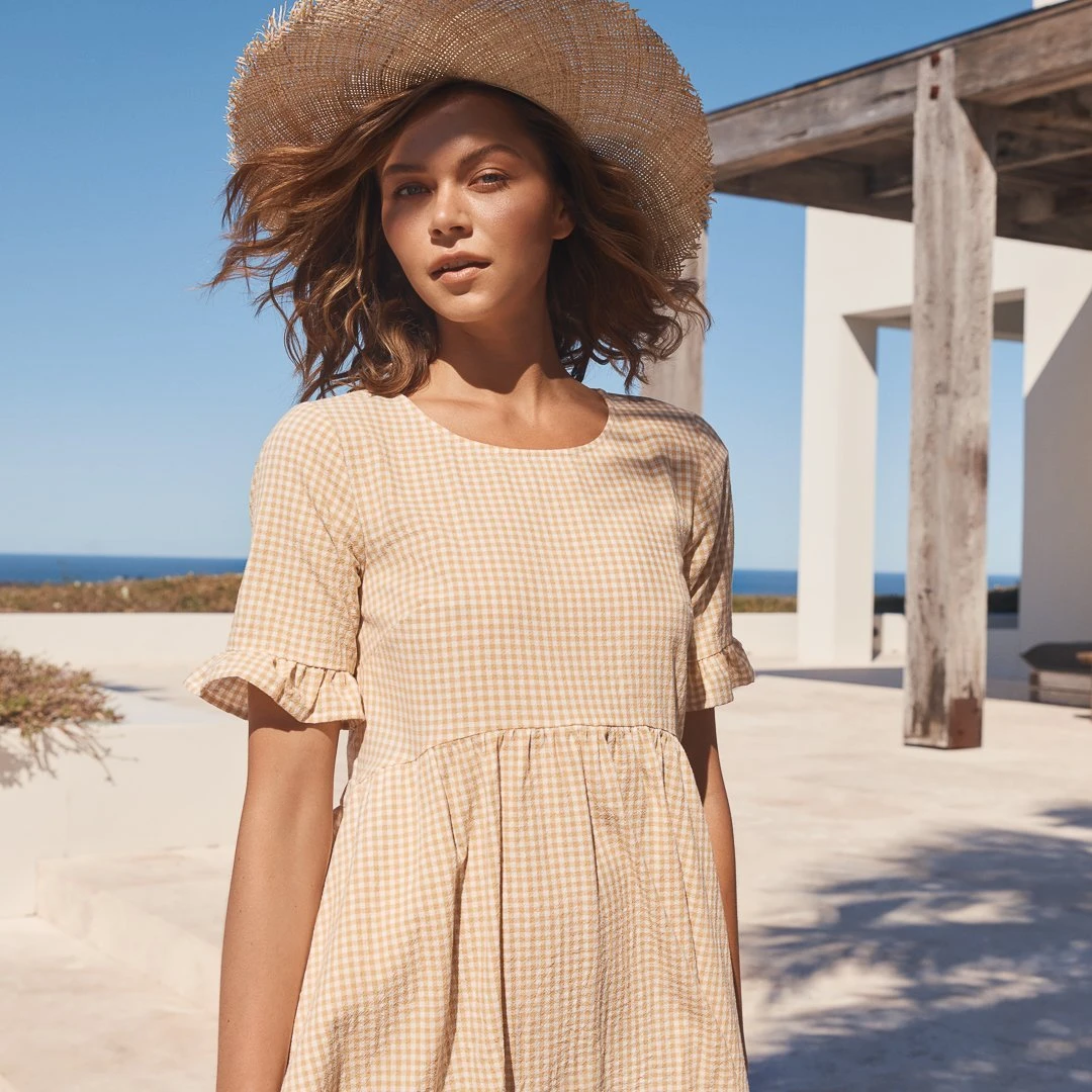 Freshen your wardrobe with our Remi Dress in Sesame Gingham. The easy pull over style with it’s free flowing shape means you can lounge all day long.