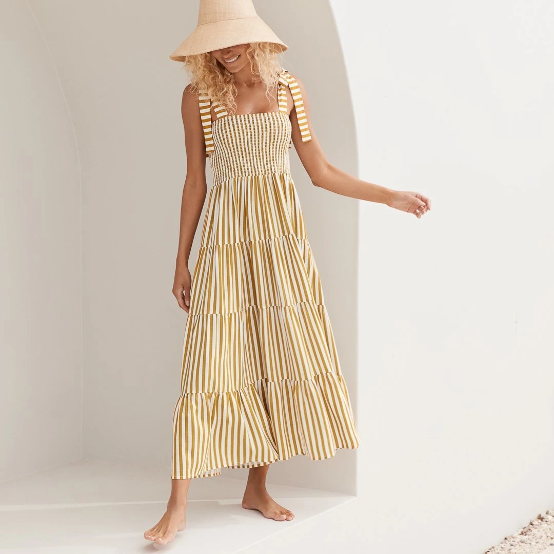 Tie the (boat) knot In the Savannah Tie Dress In San Pedro. A breezy and versatile addition to your summer wardrobe arsenal with its stripes and straps. This one is a keeper.