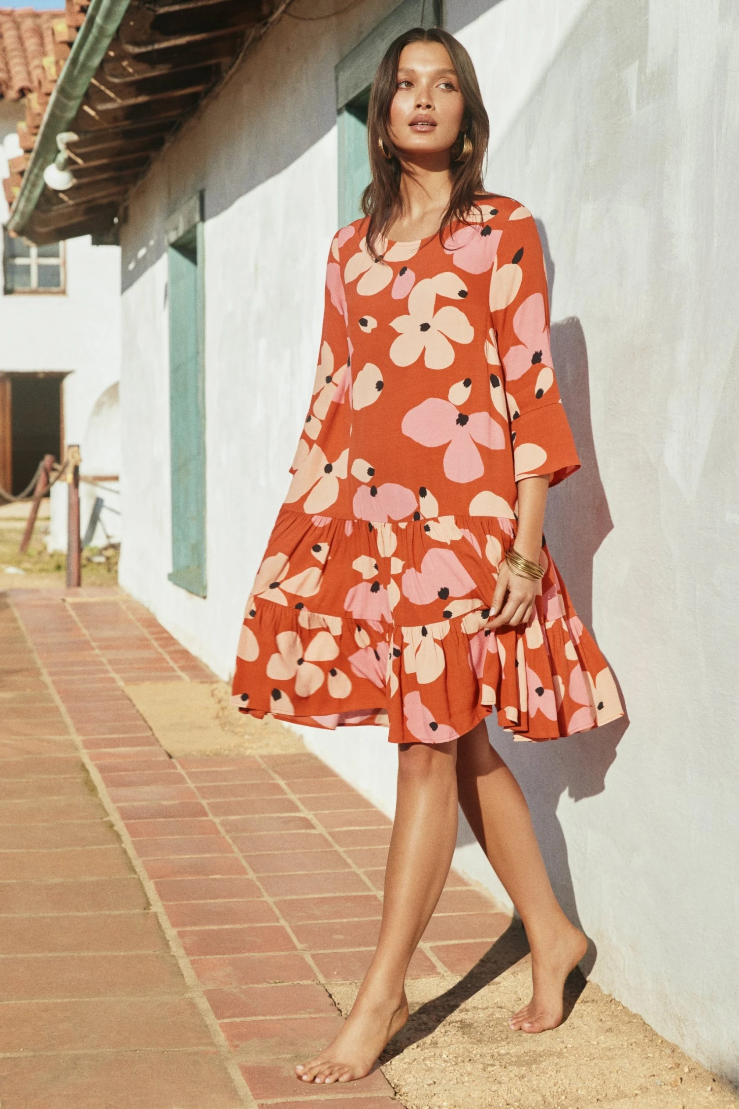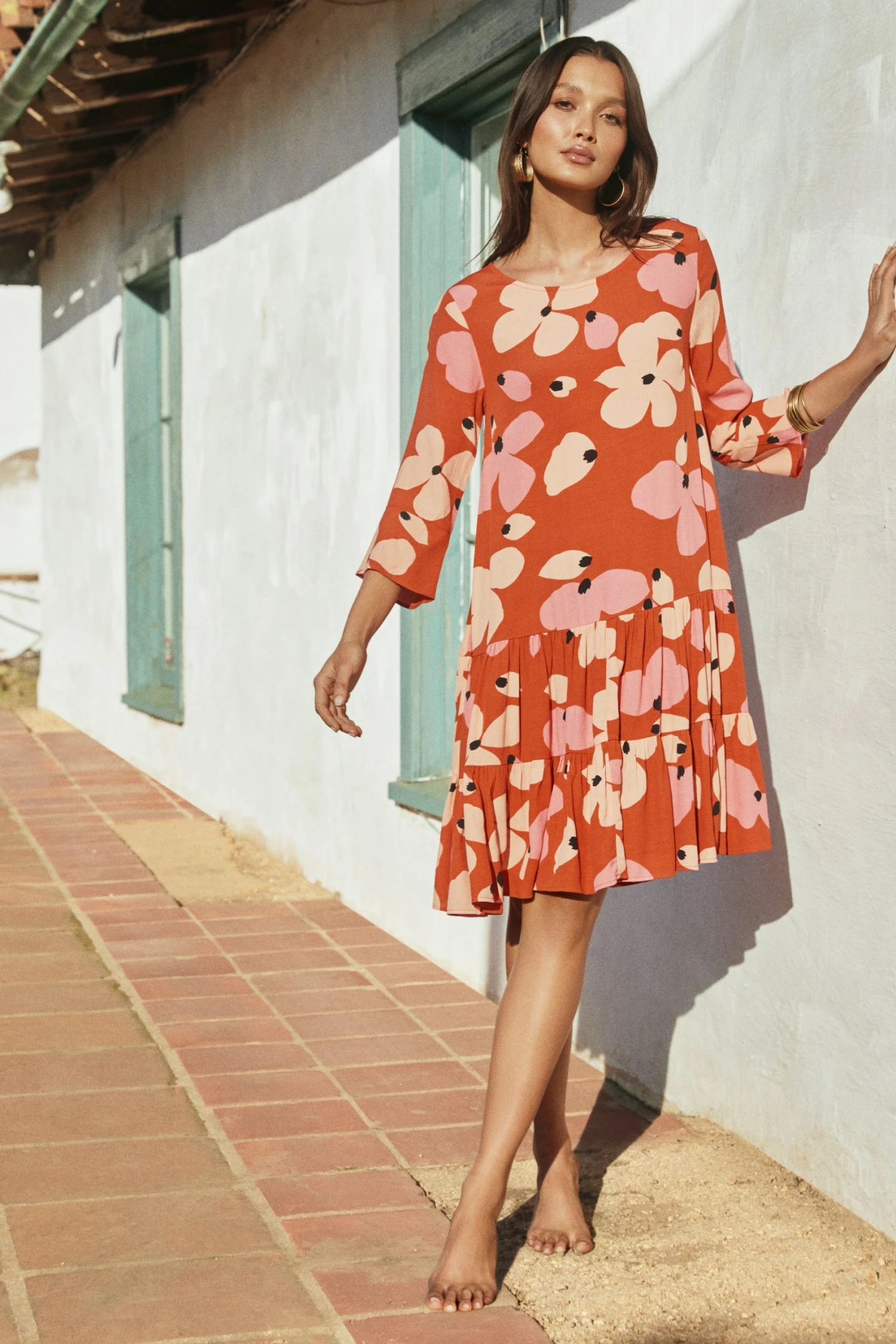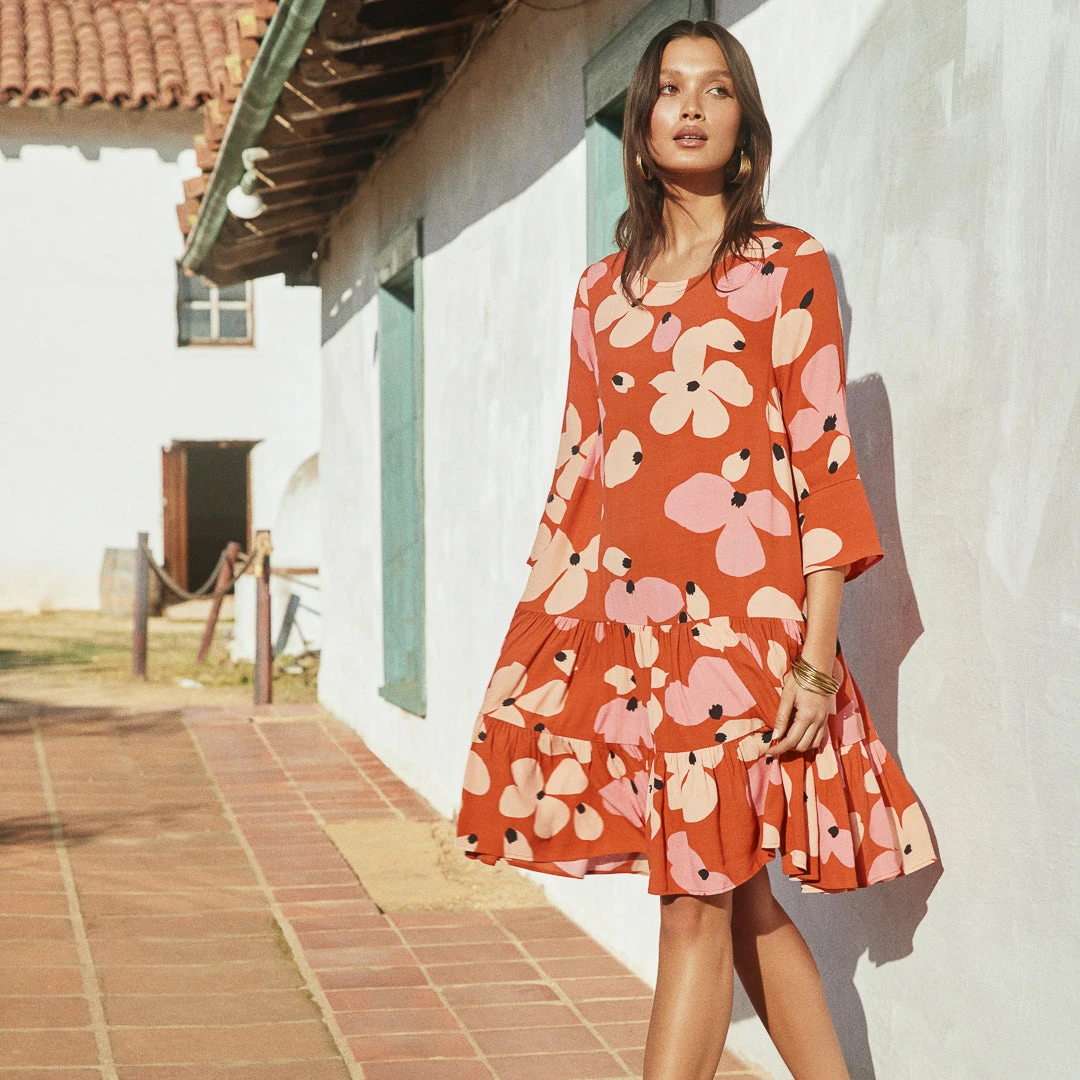 Bring the heat in the Arabella Dress in Fire Bloom. We’re loving this midi length and classic drop waist. Pair with your winter boots, or kick off your shoes for an effortless seaside look.